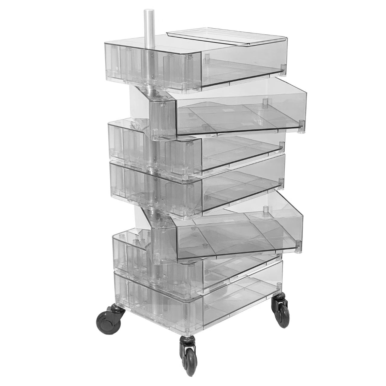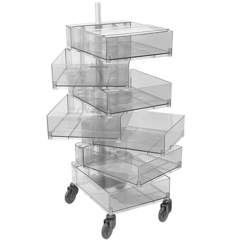 Constructed with durability in mind, the Aries 7 Tier Hairdressing Beauty Salon Trolley boasts a sturdy framework made of high-quality tinted clear ABS plastic, ensuring both transparency and resilience. The inclusion of the tinted clear ABS plastic adds a sleek and contemporary look to the unit. The joining tube, a crucial component of the trolley allows the draws to rotate 360 degree is crafted from robust stainless steel, providing stability and longevity.
