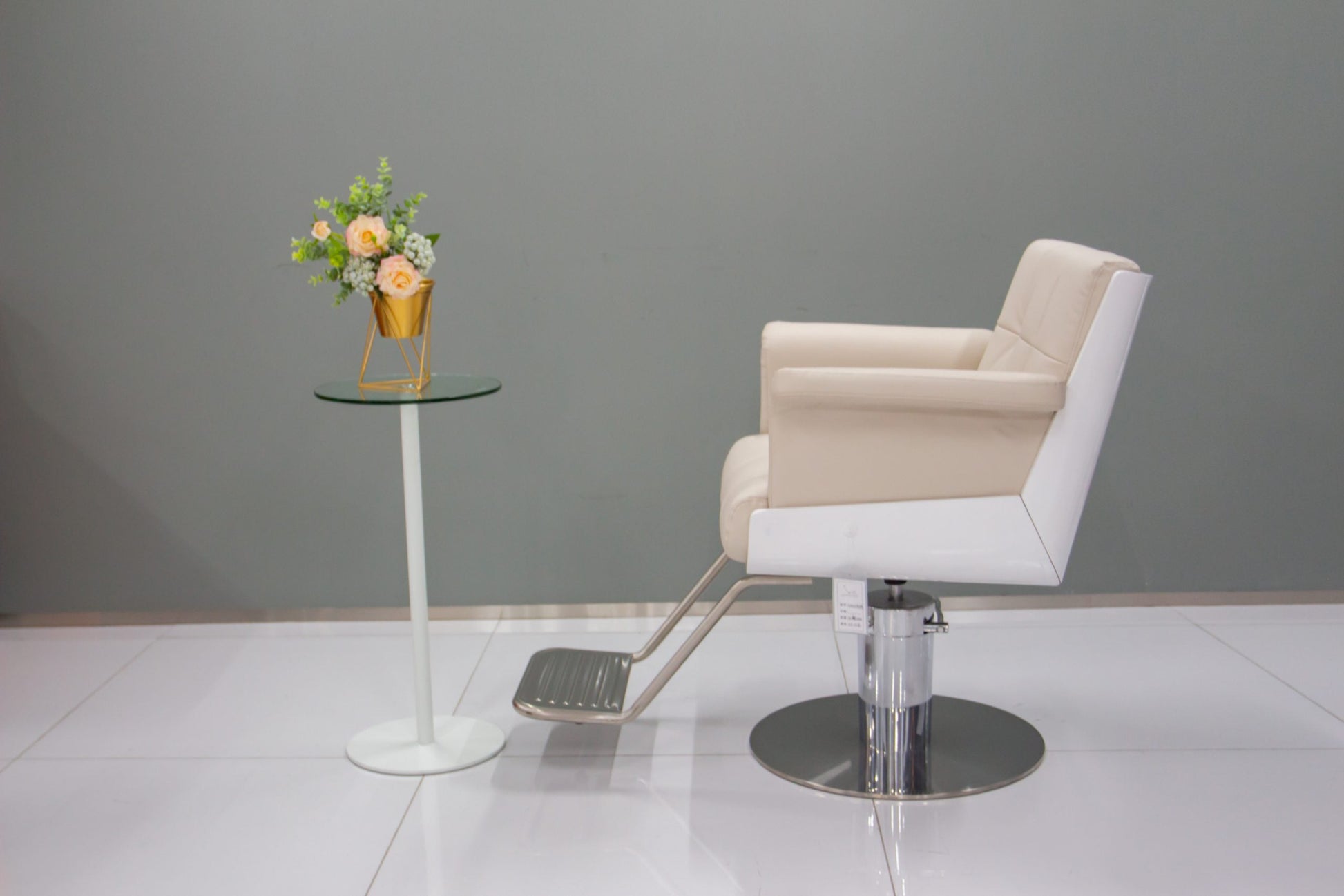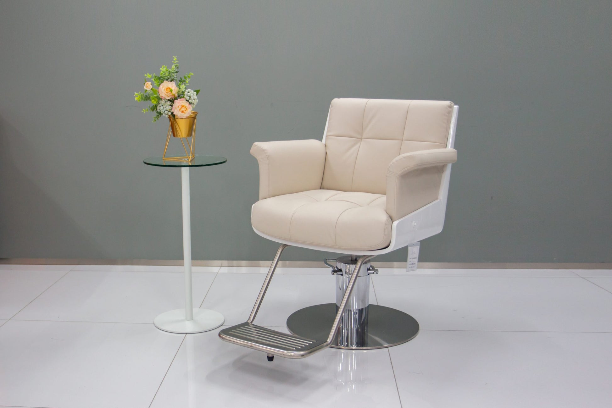 An elegant salon chair with generous padding, square tufting details, and raised armrests, all sitting atop a shiny, adjustable hydraulic base with a curved metal footrest.