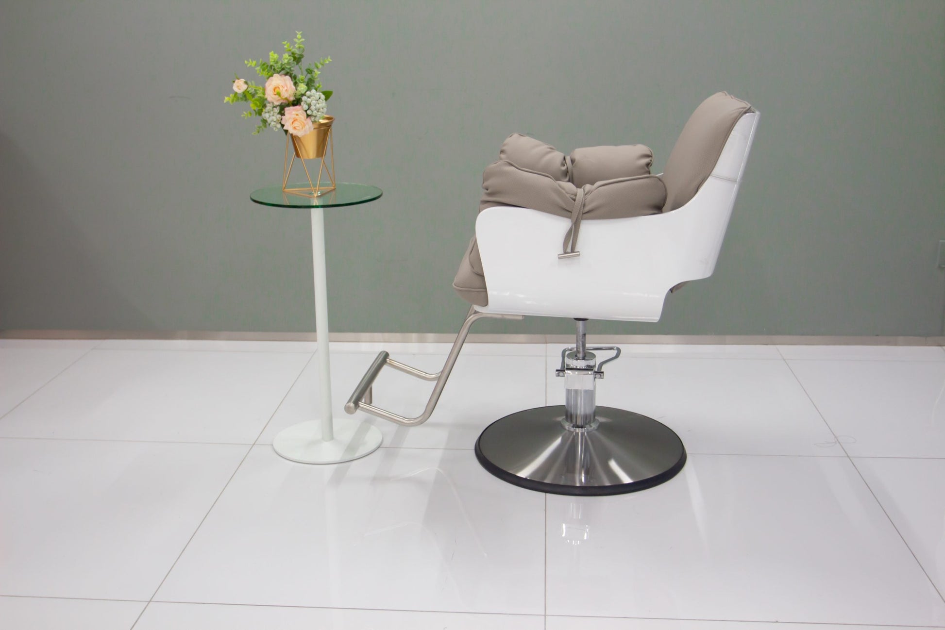 A chic salon chair with a plush, comfortable design, cushioned armrests, and a sleek circular chrome base featuring an integrated footrest and a hydraulic lift for height customization.