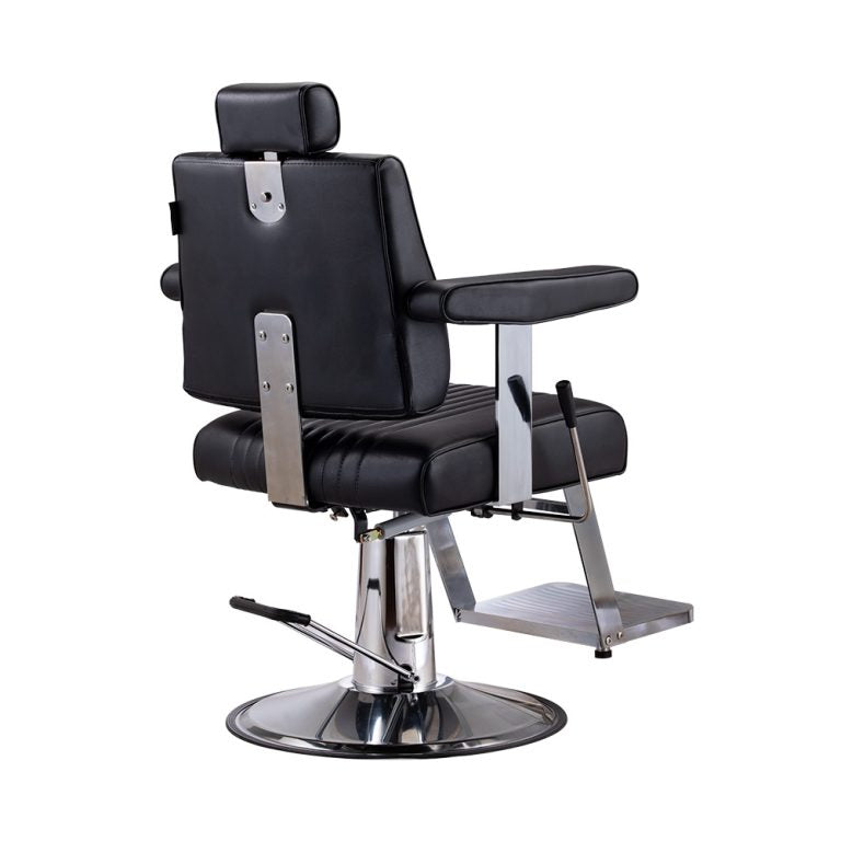 Introducing a sleek barber chair with an elegant design, featuring a streamlined seat with horizontal detailing, complemented by a lustrous metallic base. Its practical features include a reclining back, adjustable headrest, and hydraulic lift for height adjustment, topped off with a durable footrest for client comfort.