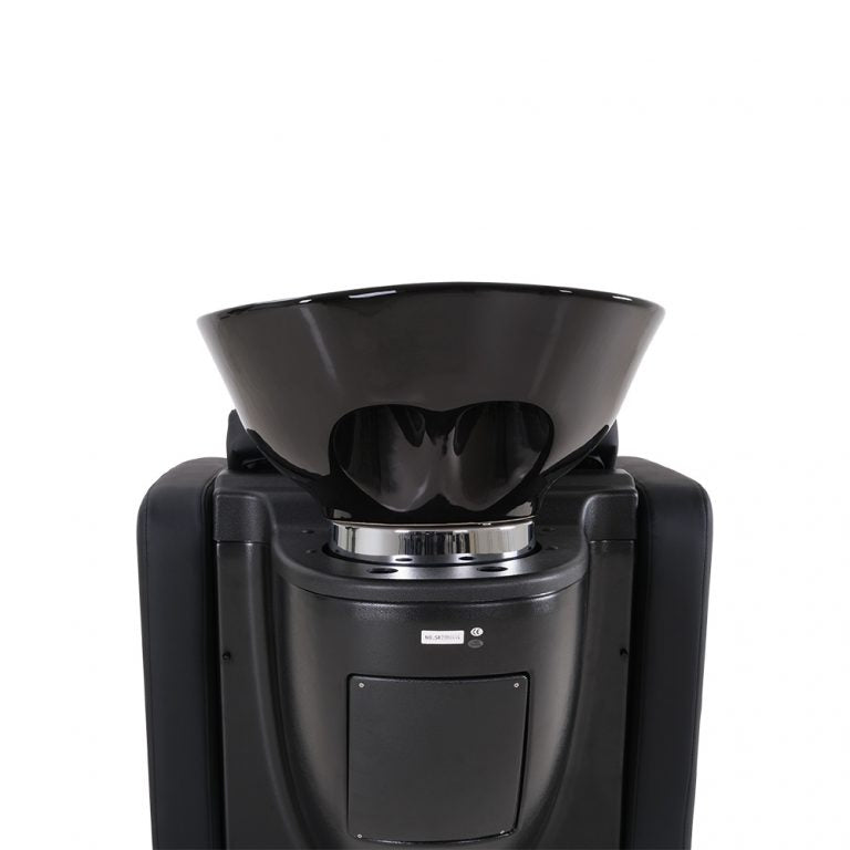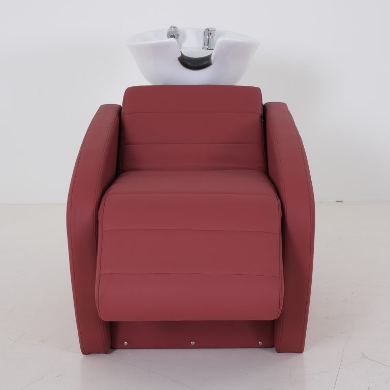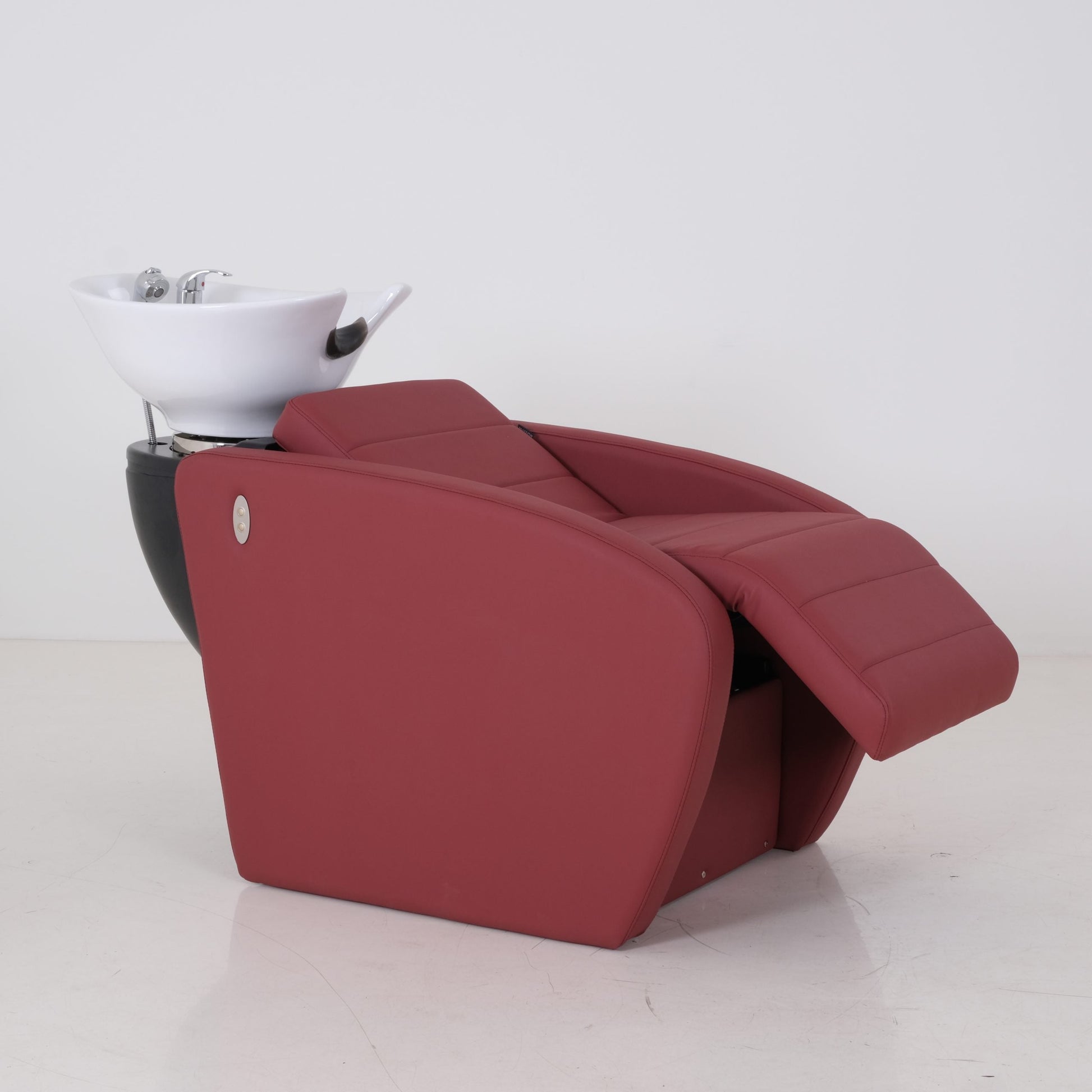 A sleek, shampoo station chair with a padded, contoured seat and leg rest designed for client comfort. It features an adjustable, tilting basin with a neck groove, a handheld sprayer, and integrated storage, ideal for efficient and stylish salon setups.