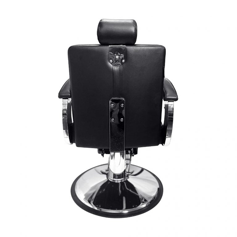 This barber chair features a sturdy construction with a sleek and modern design. It is upholstered in high-quality leather, which adds a touch of elegance to the overall look. It is ergonomically designed to provide maximum comfort for both the barber and the client.