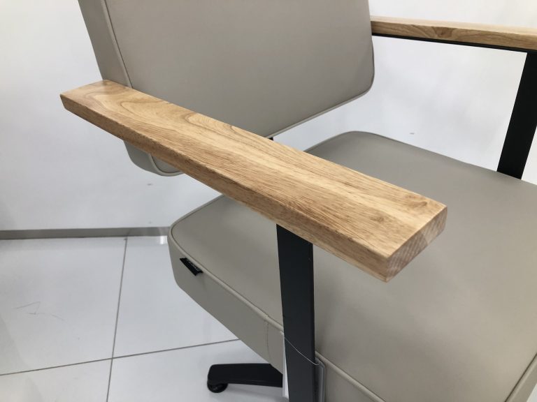 Functional and stylish, this chair features a minimalist design with a padded square seat and backrest, complemented by wooden armrests. It’s supported by a sturdy metal frame and adjustable base, complete with a practical footrest for comfort.