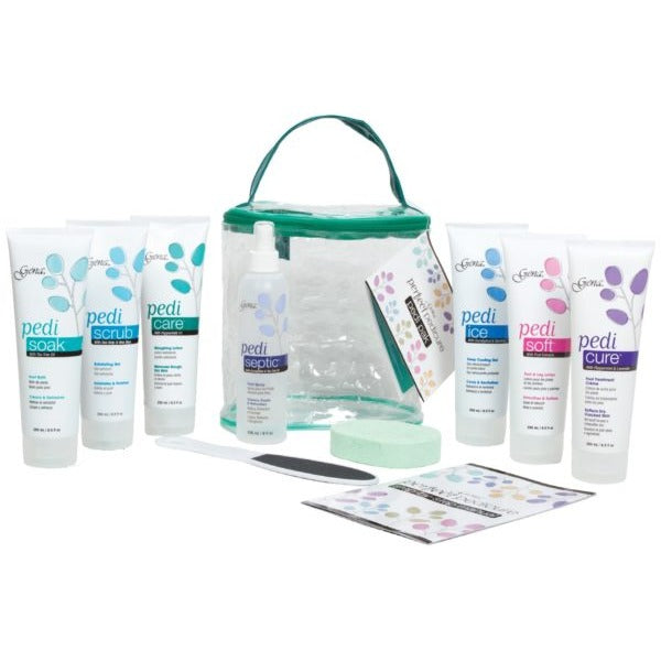 The perfect pedicure conveniently packed into a Gena tote. Kit includes: Pedi Ice™, Pedi Soft™, Pedi Soak™, Pedi Care™, Pedi Cure™, Pedi Scrub™, Pedi Septic™, Pedi Pro File™ and Sponge.