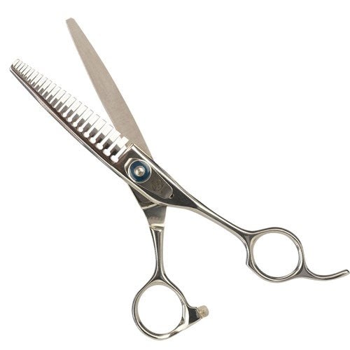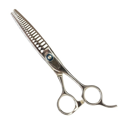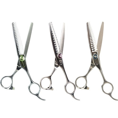 Trimz chunker scissors are essential equipment for professional pet groomers. These specialized scissors are designed to cut precisely while providing maximum comfort while pet grooming. Our grooming chunkers feature sharp edges that allow effortless fur and hair trimming. Chunker scissors ergonomic design ensures a comfortable grip and reduces strain on the groomer's hands and wrists, even during extended grooming sessions. Trimz chunkers give pet stylists the flexibility to create a variety of hairstyles and cuts due to their exceptional precision and simplicity of use while pet grooming. These Trimz chunkers are a crucial tool that will help you consistently produce stunning results. Trimz Chunker pet grooming scissors come with a stylish scissors’ holder case, a 7" steel comb, and a cleaning cloth.