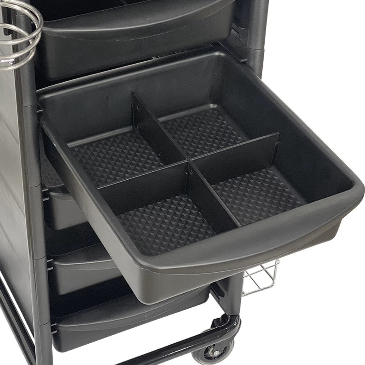 Jasper Hair Trolley Black is a sleek salon trolley designed to keep your styling tools organized and accessible. This hair trolley functions as a rolling hair color trolley, ensuring your coloring essentials are always within reach. Built as a heavy-duty hair trolley, it’s perfect for the demands of a bustling salon, making it a standout piece of professional salon equipment. Its modern black finish adds a touch of style to your workspace