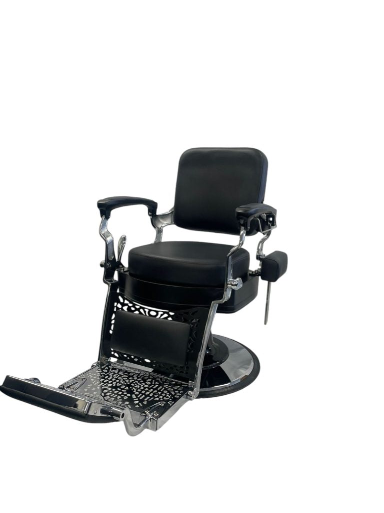 This barber chair features an opulent design with intricately patterned metalwork. The plush upholstery ensures maximum comfort, while the chair includes an adjustable headrest, reclining back, and a heavy-duty hydraulic lift. The robust footrest and armrests add to the client’s ease, making this chair a blend of luxury and functionality for any upscale salon.
