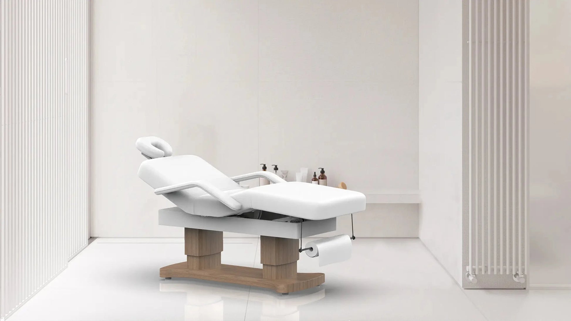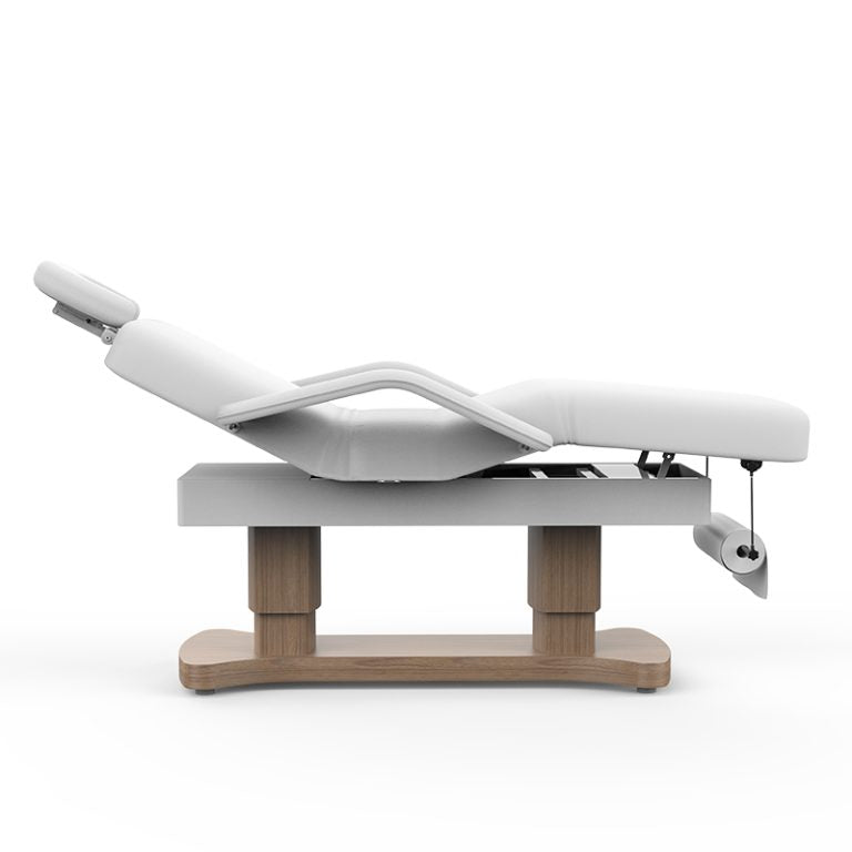 It features adjustable sections, including a reclining backrest, leg lift, and headrest with a crescent-shaped face cradle, allowing for optimal positioning and client support. Subtly integrated electric controls ensure smooth, quiet adjustments, perfect for facials, massages, or medical aesthetic treatments.